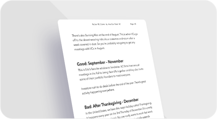 Raise Millions by Hustle Fund VC Page 43 There’s also Burning Man at the end of August. This is when VCs go off to the desert wearing ridiculous costumes and return after a week covered in dust. So you’re probably not going to get any meetings with VCs in August. Good: September – November This is Eric’s favorite window to fundraise. VC firms host annual meetings in the Fall to bring their LPs together and they also invite some of their portfolio founders to meet everyone. Investors rush to do deals before the end of the year. There’s great activity happening everywhere. Bad: After Thanksgiving – December In the United States, we have this major holiday called Thanksgiving. It happens every year on the 3rd Thursday of November. It’s a pretty big deal. Schools are closed. No one really wants to work that week. But it turns out that the feeling of not working basically extends through the end of the year. Of course, most VCs come back to work after Thanksgiving. But Eric has been in VC offices around this time. There’s eggnog and snacks everywhere. Michael Buble's music is playing in the background. The energy is super low key. hustlefund.vc / @hustlefundvc