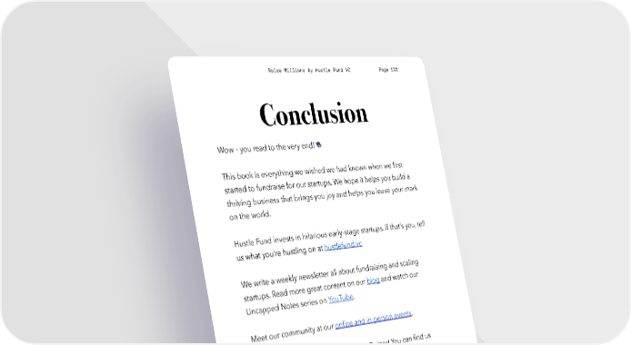 Raise Millions by Hustle Fund VC Page 133 Conclusion Wow – you read to the very end! This book is everything we wished we had known when we first started to fundraise for our startups. We hope it helps you build a thriving business that brings you joy and helps you leave your mark on the world. Hustle Fund invests in hilarious early-stage startups. If that’s you, tell us what you’re hustling on at hustlefund.vc We write a weekly newsletter all about fundraising and scaling startups. Read more great content on our blog and watch our Uncapped Notes series on YouTube. Meet our community at our online and in-person events. Did you like the book? Let us know on Twitter! You can find us @mrtampham, @ericbahn, @dunkhippo33, @shiyankoh, @kerademars, @hustlefundvc Do you know other founders who needs this book? Share this link: bit.ly/RaiseMillions ! Questions? Email us at [email protected]. hustlefund.vc / @hustlefundvc