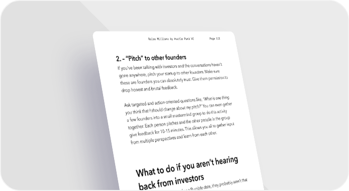 Raise Millions by Hustle Fund VC Page 112 2. – “Pitch” to other founders If you've been talking with investors and the conversations haven’t gone anywhere, pitch your startup to other founders. Make sure these are founders you can absolutely trust. Give them permission to drop honest and brutal feedback. Ask targeted and action-oriented questions like, “What is one thing you think that I should change about my pitch?” You can even gather a few founders into a small mastermind group to do this activity together. Each person pitches and the other people in the group give feedback for 10-15 minutes. This allows you all to gather input from multiple perspectives and learn from each other. What to do if you aren’t hearing back from investors If someone ghosts you after a Bumble date, they probably aren’t that interested in you. But investors are a different story. 1. Be persistent in following up Elizabeth used to think that investors would get annoyed if she bugged them too much. But now that she’s on the other side of the table, she doesn’t even notice if someone has pinged her three times because she’s overwhelmed with emails. hustlefund.vc / @hustlefundvc