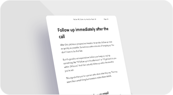 Raise Millions by Hustle Fund VC Page 91 Follow up immediately after the call After Eric pitches a prospective investor, he sends a follow-up note as quickly as possible. Sometimes within minutes of hanging up. You don’t have to be that fast. But it’s good to set expectations before you hang up, saying something like “I’ll follow up in the afternoon” or “I’ll get back to you within 24 hours.” And then actually follow up within the timeline you’ve set. This signals that you’re a person who does what they say. This may seem like a small thing but investors notice these details. Craft the perfect follow-up email Let’s talk about the anatomy of a great follow-up email, then we’ll show you an example template that you can use in your follow-up emails. First, we recommend reiterating details that made the other person excited during the call. Here’s an example. hustlefund.vc / @hustlefundvc