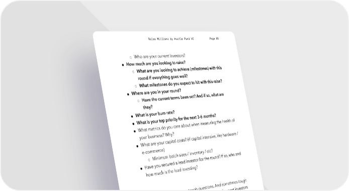 Raise Millions by Hustle Fund VC Page 85 ○ Who are your current investors? ● How much are you looking to raise? ○ What are you looking to achieve (milestones) with this round if everything goes well? ○ What milestones do you expect to hit with this raise? ● Where are you in your round? ○ Have the current terms been set? And if so, what are they? ● What is your burn rate? ● What is your top priority for the next 3-6 months? ● What metrics do you care about when measuring the health of your business? Why? ● What are your capital costs? (if capital intensive, like hardware / e-commerce) ○ Minimum batch sizes / inventory / etc? ● Have you secured a lead investor for the round? If so, who and how much is the lead investing? We recognize that these are tough questions. And sometimes tough questions put people on the defensive. A red flag for most investors is when founders get SUPER defensive, or even dismissive of the questions or ideas that investors bring to the table. This is because a defensive founder indicates that they are probably not coachable. Now you should feel free to push back against an investor if you have a different opinion. Especially if you have data to back up that hustlefund.vc / @hustlefundvc