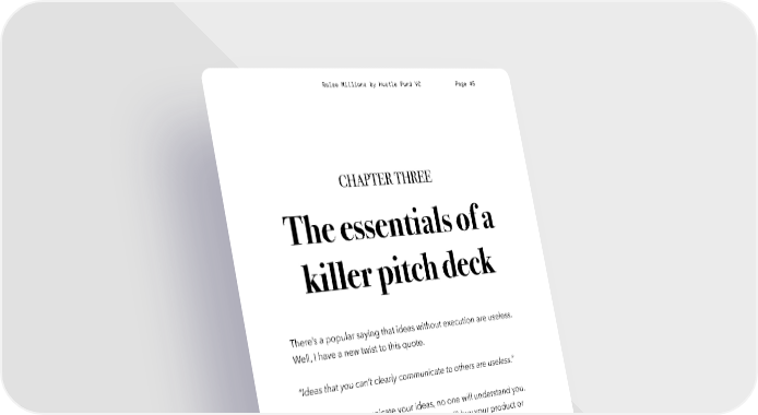 Raise Millions by Hustle Fund VC Page 45 CHAPTER THREE The essentials of a killer pitch deck There’s a popular saying that ideas without execution are useless. Well, I have a new twist to this quote. “Ideas that you can’t clearly communicate to others are useless.” If you can’t communicate your ideas, no one will understand you. And if no one understands you, no one will buy your product or invest in your company. This means great communication is everything. After reviewing thousands of pitch decks and raising $100M for Hustle Fund, Eric has deduced the five most essential parts for a great pitch. hustlefund.vc / @hustlefundvc