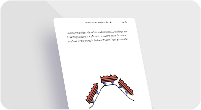 Raise Millions by Hustle Fund VC Page 132 Continue to be lean, disciplined, and resourceful. Don’t forget your bootstrapper roots. It might even be easier to ignore the fact that you have all this money in the bank. Whatever helps you stay alive. hustlefund.vc / @hustlefundvc