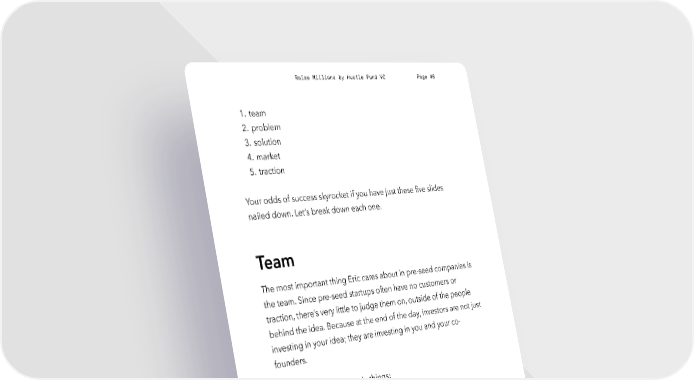 Raise Millions by Hustle Fund VC Page 46 1. team 2. problem 3. solution 4. market 5. traction Your odds of success skyrocket if you have just these five slides nailed down. Let’s break down each one. Team The most important thing Eric cares about in pre-seed companies is the team. Since pre-seed startups often have no customers or traction, there’s very little to judge them on, outside of the people behind the idea. Because at the end of the day, investors are not just investing in your idea; they are investing in you and your co- founders. Eric wants to see two main things: 1. Relevant skills + background Let's say you have an idea for a business that would eradicate COVID. Obviously, this is a pretty intriguing idea: COVID is a big problem and people would almost certainly be willing to pay for a solution. But it doesn't matter how big the problem is if an investor doesn't believe you're the right team to solve it. hustlefund.vc / @hustlefundvc