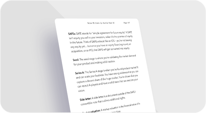 Raise Millions by Hustle Fund VC Page 147 SAFEs: SAFE stands for “simple agreement for future equity.” A SAFE isn’t equity you sell to your investors, rather it’s the promise of equity in the future. Think of SAFEs almost like an IOU – you’re not issuing any equity yet… but once you have an equity financing round, an acquisition, or an IPO, that SAFE will get converted into equity. Seed: The seed stage is where you're validating the market demand for your product and making solid traction. Series A: The Series A stage is when you’ve found product-market fit and can scale your business. You have strong evidence that you can capture a decent share of the huge market. You’ve shown that you can recruit A-players and have a solid team that can execute your vision. Side letter: A side letter is a document outside of the SAFE / convertible note that outlines additional rights. Startup valuation: A startup valuation is the financial value of a startup’s equity at a given point in time. Unit economics: the cost of acquiring and onboarding a customer compared to how much money you make from that customer. Vesting: Founders and employees earn shares by working for the startup, but their shares vest across 4 years. This means they don’t get all the shares upfront when they start/join the company. They have to work at the company for 4 years to get all of them. Vesting hustlefund.vc / @hustlefundvc