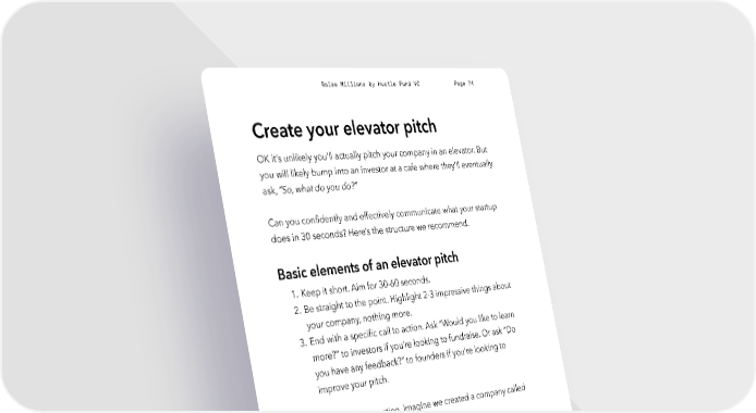 Raise Millions by Hustle Fund VC Page 74 Create your elevator pitch OK it’s unlikely you’ll actually pitch your company in an elevator. But you will likely bump into an investor at a cafe where they’ll eventually ask, “So, what do you do?” Can you confidently and effectively communicate what your startup does in 30 seconds? Here’s the structure we recommend. Basic elements of an elevator pitch 1. Keep it short. Aim for 30-60 seconds. 2. Be straight to the point. Highlight 2-3 impressive things about your company, nothing more. 3. End with a specific call to action. Ask “Would you like to learn more?” to investors if you’re looking to fundraise. Or ask “Do you have any feedback?” to founders if you’re looking to improve your pitch. Now let’s see this in action. Imagine we created a company called The Well Crafted Adventure. “Let's say you're traveling in the next 12 months and you have a few places picked out for business, family, and friends. You can tell the app more about the type of adventuring you like to do, your fitness level, where you plan to travel, etc. And this app will spit out recommended adventures in each location. It will connect you with a local expert and it'll provide a list of places where you can rent gear hustlefund.vc / @hustlefundvc