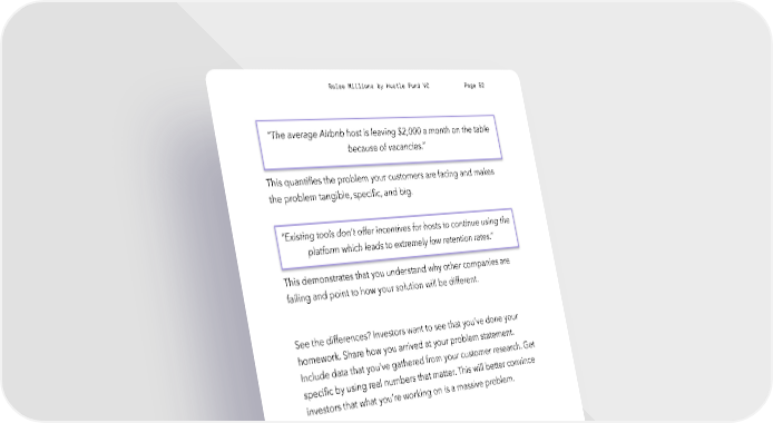 Raise Millions by Hustle Fund VC Page 52 “The average Airbnb host is leaving $2,000 a month on the table because of vacancies.” This quantifies the problem your customers are facing and makes the problem tangible, specific, and big. “Existing tools don't offer incentives for hosts to continue using the platform which leads to extremely low retention rates.” This demonstrates that you understand why other companies are failing and point to how your solution will be different. See the differences? Investors want to see that you’ve done your homework. Share how you arrived at your problem statement. Include data that you’ve gathered from your customer research. Get specific by using real numbers that matter. This will better convince investors that what you’re working on is a massive problem. Solution There are 3 important things to consider when putting together your “solution” slide: 1. Differentiation 2. Framing your story 3. Product vision hustlefund.vc / @hustlefundvc
