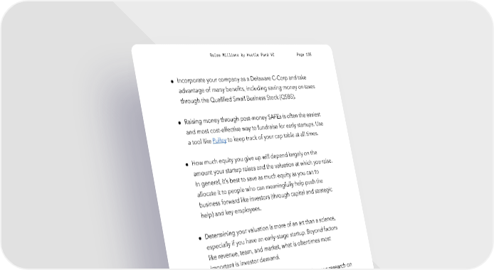 Raise Millions by Hustle Fund VC Page 135 ● Incorporate your company as a Delaware C-Corp and take advantage of many benefits, including saving money on taxes through the Qualified Small Business Stock (QSBS). ● Raising money through post-money SAFEs is often the easiest and most cost-effective way to fundraise for early startups. Use a tool like Pulley to keep track of your cap table at all times. ● How much equity you give up will depend largely on the amount your startup raises and the valuation at which you raise. In general, it’s best to save as much equity as you can to allocate it to people who can meaningfully help push the business forward like investors (through capital and strategic help) and key employees. ● Determining your valuation is more of an art than a science, especially if you have an early-stage startup. Beyond factors like revenue, team, and market, what is oftentimes most important is investor demand. ● Be aware of the current market conditions. Do your research on how the market is before you fundraise. This will impact your fundraising strategy. ● The best months to fundraise are from January - May and September - November. Avoid fundraising in August and during the Thanksgiving - New Year period. hustlefund.vc / @hustlefundvc