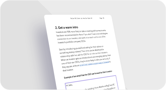 Raise Millions by Hustle Fund VC Page 70 2. Get a warm intro Investors are 93% more likely to take a meeting with someone who has been recommended to them. If you don’t have a second-degree connection to an investor, one tactic is to reach out to one of the investor’s portfolio company CEOs. Start by introducing yourself and asking for their advice on something startup-related. Then once you’ve developed a relationship with her, ask the CEO for an intro to their investors. When an investor gets an introduction to an emerging startup from one of their star CEOs, they’re more likely to take you seriously. If they say yes, write an email that makes it super easy to forward to that investor. Example of an email that the CEO can forward to their investor: Hi Jake, Thank you in advance for sending this to Martha at BigCrazy VC. We’re raising our seed round and I’d like to get her thoughts on HippoCo. Here’s a quick background: The $180B hippo education market is antiquated and ripe for disruption: hustlefund.vc / @hustlefundvc