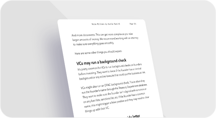 Raise Millions by Hustle Fund VC Page 121 And more documents. This can get more complex as you raise larger amounts of money. We recommend working with an attorney to make sure everything goes smoothly. Here are some other things you should expect. VCs may run a background check It’s pretty common for VCs to run background checks on founders before investing. They want to know if the founder has a criminal background or any active lawsuits that could put the business at risk. VCs might also run an OFAC background check. This is when they run the founder’s name through the Treasury Department database. They want to make sure the founder isn't aligned with terrorism or on any ban lists, sanctions list, etc. If the founder has a common name, this might trigger a false positive and they may need to clear things up with their VC. VCs will ask you to sign a side letter A side letter is a document outside of the SAFE / convertible note that outlines additional rights. You’ll likely see these two from VCs: 1. Pro Rata Rights — this allows the VC to invest more capital into your company in future fundraises typically on a “proportional” basis (the right to reinvest the amount required to maintain the equivalent percentage of equity as before). hustlefund.vc / @hustlefundvc