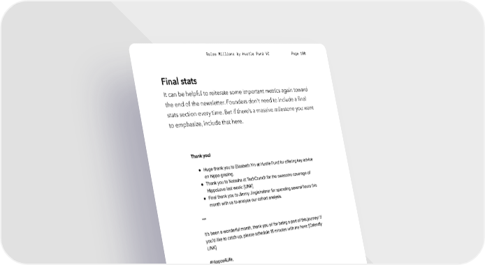 Raise Millions by Hustle Fund VC Page 108 Final stats It can be helpful to reiterate some important metrics again toward the end of the newsletter. Founders don't need to include a final stats section every time. But if there’s a massive milestone you want to emphasize, include that here. Thank yous It’s possible to train people to read a specific section of your newsletter by giving them a chance to see their own name listed. In our Hustle Fund investor newsletter, we give a dozen shout-outs to hustlefund.vc / @hustlefundvc