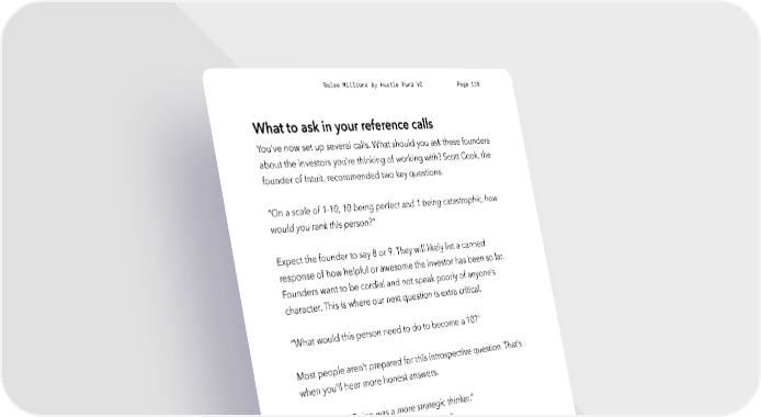 Raise Millions by Hustle Fund VC Page 119 What to ask in your reference calls You’ve now set up several calls. What should you ask these founders about the investors you’re thinking of working with? Scott Cook, the founder of Intuit, recommended two key questions. “On a scale of 1-10, 10 being perfect and 1 being catastrophic, how would you rank this person?” Expect the founder to say 8 or 9. They will likely list a canned response of how helpful or awesome the investor has been so far. Founders want to be cordial and not speak poorly of anyone’s character. This is where our next question is extra critical. “What would this person need to do to become a 10?” Most people aren’t prepared for this introspective question. That's when you’ll hear more honest answers. ● “I wish Quinn was a more strategic thinker.” ● “I wish Mohit was more responsive.” ● “I think Avery goes on vacation too much.” When to conduct investor reference calls Do your investor reference calls AFTER the investor commits and BEFORE you accept. Don’t waste your time doing investor reference calls before they’ve even committed because it might be a wasted hustlefund.vc / @hustlefundvc