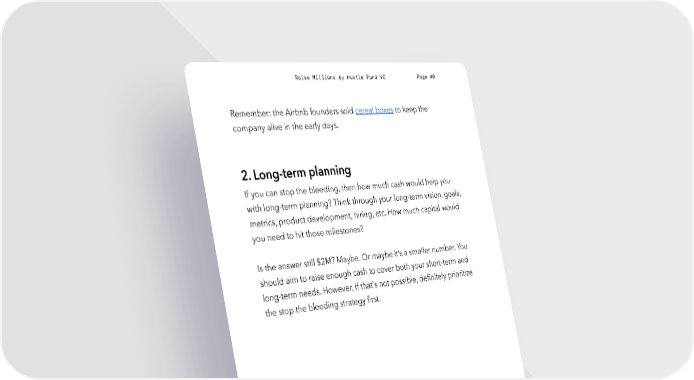 Raise Millions by Hustle Fund VC Page 40 Remember: the Airbnb founders sold cereal boxes to keep the company alive in the early days. 2. Long-term planning If you can stop the bleeding, then how much cash would help you with long-term planning? Think through your long-term vision, goals, metrics, product development, hiring, etc. How much capital would you need to hit those milestones? Is the answer still $2M? Maybe. Or maybe it’s a smaller number. You should aim to raise enough cash to cover both your short-term and long-term needs. However, if that's not possible, definitely prioritize the stop the bleeding strategy first. hustlefund.vc / @hustlefundvc