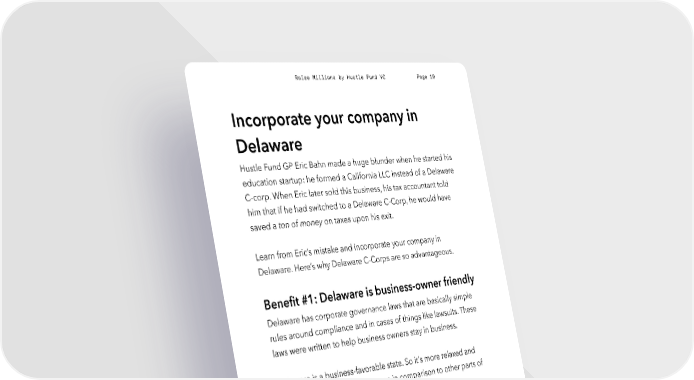 Raise Millions by Hustle Fund VC Page 19 Incorporate your company in Delaware Hustle Fund GP Eric Bahn made a huge blunder when he started his education startup: he formed a California LLC instead of a Delaware C-corp. When Eric later sold this business, his tax accountant told him that if he had switched to a Delaware C-Corp, he would have saved a ton of money on taxes upon his exit. Learn from Eric’s mistake and incorporate your company in Delaware. Here’s why Delaware C-Corps are so advantageous. Benefit #1: Delaware is business-owner friendly Delaware has corporate governance laws that are basically simple rules around compliance and in cases of things like lawsuits. These laws were written to help business owners stay in business. Delaware is a business-favorable state. So it's more relaxed and easier to do business in Delaware in comparison to other parts of the US. Benefit #2: You’ll save a ton of money on taxes There’s this thing called the Qualified Small Business Stock (QSBS). If your business is a Delaware C-Corp and has been around for more than five years before getting acquired, you could potentially be hustlefund.vc / @hustlefundvc