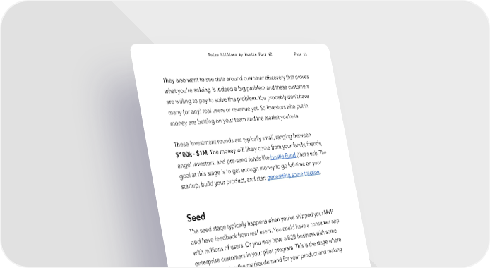Raise Millions by Hustle Fund VC Page 11 They also want to see data around customer discovery that proves what you’re solving is indeed a big problem and these customers are willing to pay to solve this problem. You probably don’t have many (or any) real users or revenue yet. So investors who put in money are betting on your team and the market you’re in. These investment rounds are typically small, ranging between $100k - $1M. The money will likely come from your family, friends, angel investors, and pre-seed funds like Hustle Fund (that’s us!). The goal at this stage is to get enough money to go full-time on your startup, build your product, and start generating some traction. Seed The seed stage typically happens when you’ve shipped your MVP and have feedback from real users. You could have a consumer app with millions of users. Or you may have a B2B business with some enterprise customers in your pilot program. This is the stage where you're validating the market demand for your product and making solid traction. Seed rounds typically range from $500k to $3M. The goal at this stage is to generate traction and find product-market fit. The typical traction range is ~$10k+/month. hustlefund.vc / @hustlefundvc