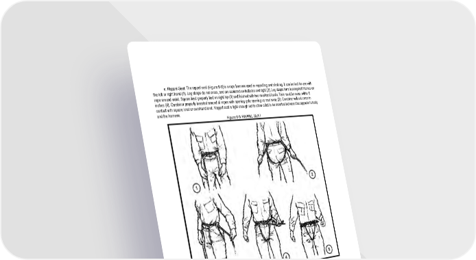 e. Rappel Seat. The rappel seat (Figure 9-9) is a rope harness used in rappelling and climbing. It can be tied for use with the left or right hand (1). Leg straps do not cross, and are centered on buttocks and tight (2). Leg straps form locking half hitches on rope around waist. Square knot properly tied on right hip (3) and finished with two overhand knots. Tails must be even, within 6 inches (4). Carabiner properly inserted around all ropes with opening gate opening up and away (5). Carabiner will not come in contact with square knot or overhand knot. Rappel seat is tight enough not to allow a fist to be inserted between the rappeller’s body and the harness. Figure 9-9. RAPPEL SEAT
