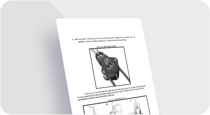 b. Mechanical Belay. This belay (Figure 9-16) uses mechanical devices to help the belayer control the rope, as in rappelling. A variety of mountaineering devices are used to construct a mechanical belay. Figure 9-16. MECHANICAL BELAY (1) Munter Hitch. One of the most often used belays; the Munter Hitch (Figure 9-17) requires very little equipment. The rope is routed through a locking pear-shaped carabiner, then back on itself. The belayer controls the rate of descent by manipulating the working end back on itself with his brake hand. Figure 9-17. MUNTER HITCH