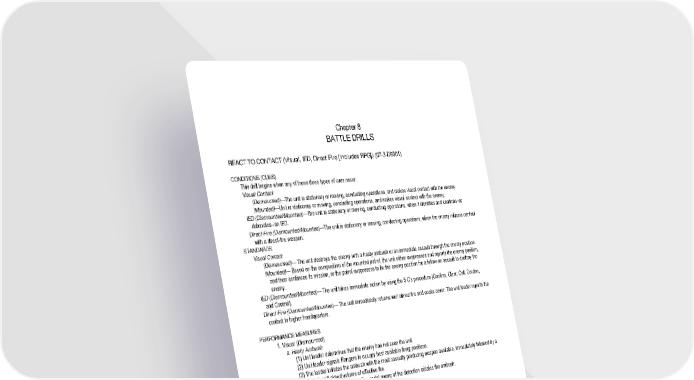 8 - 1 Chapter 8 BATTLE DRILLS REACT TO CONTACT (Visual, IED, Direct Fire [includes RPG]) (07-3-D9501) CONDITIONS (CUES) This drill begins when any of these three types of cues occur: Visual Contact (Dismounted)—The unit is stationary or moving, conducting operations, and makes visual contact with the enemy. (Mounted)—Unit is stationary or moving, conducting operations, and makes visual contact with the enemy. IED (Dismounted/Mounted)—The unit is stationary or moving, conducting operations, when it identifies and confirms–or detonates–an IED. Direct Fire (Dismounted/Mounted)—The unit is stationary or moving, conducting operations, when the enemy initiates contact with a direct-fire weapon. STANDARDS Visual Contact (Dismounted)— The unit destroys the enemy with a hasty ambush or an immediate assault through the enemy position. (Mounted)— Based on the composition of the mounted patrol, the unit either suppresses and reports the enemy position, and then continues its mission, or the patrol suppresses to fix the enemy position for a follow-on assault to destroy the enemy. IED (Dismounted/Mounted)— The unit takes immediate action by using the 5 C’s procedure (Confirm, Clear, Call, Cordon, and Control). Direct Fire (Dismounted/Mounted)— The unit immediately returns well aimed fire and seeks cover. The unit leader reports the contact to higher headquarters. PERFORMANCE MEASURES 1. Visual (Dismounted) a. Hasty Ambush (1) Unit leader determines that the enemy has not seen the unit. (2) Unit leader signals Rangers to occupy best available firing positions. (3) The leader initiates the ambush with the most casualty producing weapon available, immediately followed by a sustained, well aimed volume of effective fire. (4) If prematurely detected, the Ranger(s) aware of the detection initiates the ambush. (5) The unit destroys the enemy or forces him to withdraw. (6) The unit leader reports the contact to higher headquarters. b. Immediate Assault (1) The unit and the enemy simultaneously detect each other at close range. (2) All Rangers who see the enemy should engage and announce "Contact" with a clock direction and distance to enemy, for example, "Contact three o'clock, 100 meters." (3) Elements in contact immediately assault the enemy using fire and movement. (4) The unit destroys the enemy or forces him to withdraw. (5) The unit leader reports the contact to higher headquarters. 2. Visual (Mounted) a. The Ranger who spots the enemy announces the contact. b. The element in contact immediately suppresses the enemy. c. The vehicle commander of the vehicle in contact sends contact report over the radio. d. The unit maneuvers on the enemy or continues to move along route. e. Vehicle gunners fix and suppress the enemy positions. f. The unit leader reports the contact to higher headquarters.