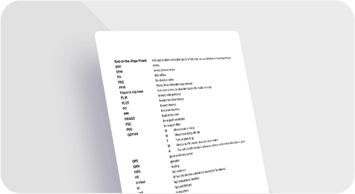Glossary - 3 End-of–the–Rope Prusik knot used to attach a movable rope to a fixed rope; see also Middle-of–the–Rope Prusik ENY enemy EPW enemy prisoner of war FA field artillery FDC fire direction center FFIR friendly force information requirements Figure 8 slip knot knot used to form an adjustable bight in the middle of a rope FLIR forward looking infrared FLOT forward line of own troops FO forward observer FPF final protective fires FRAGO fragmentary order FSC fire support coordinator FSO fire support officer GOTWA G Where leader is Going O Others he is taking with him T Time he plans to go W What to do if the leader does not return in time A The unit’s and the leader’s actions on chance contact while the leader is gone GPS global positioning system GRN grenadier HDG heading HE high explosive H-Hour hit hour (the time the unit plans to accomplish the mission) HI high temperature (weather) HPT high-payoff target HQ headquarters IAW in accordance with ICM improved conventional munitions ID identification IP initial point IR information requirements ERRP en route to release point JAAT joint air attack team JD Julian date KIA killed in action LAW light antiarmor weapon LBV load-bearing vest LD line of departure
