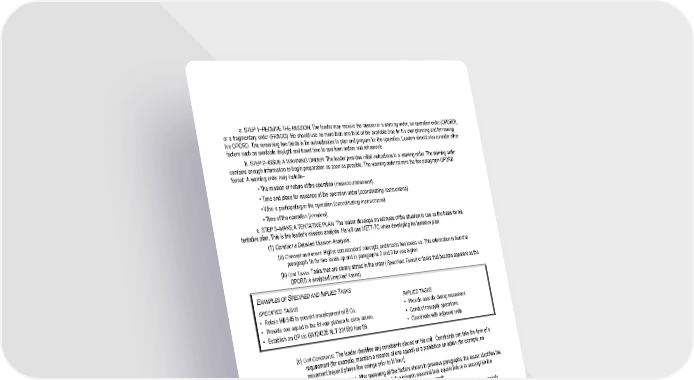 a. STEP 1–RECEIVE THE MISSION. The leader may receive the mission in a warning order, an operation order (OPORD), or a fragmentary order (FRAGO). He should use no more than one third of the available time for his own planning and for issuing his OPORD. The remaining two thirds is for subordinates to plan and prepare for the operation. Leaders should also consider other factors such as available daylight and travel time to and from orders and rehearsals. b. STEP 2–ISSUE A WARNING ORDER. The leader provides initial instructions in a warning order. The warning order contains enough information to begin preparation as soon as possible. The warning order mirrors the five paragraph OPORD format. A warning order may include– • The mission or nature of the operation (mission statement). • Time and place for issuance of the operation order (coordinating instructions). • Who is participating in the operation (coordinating instructions). • Time of the operation (timeline). c. STEP 3–MAKE A TENTATIVE PLAN. The leader develops an estimate of the situation to use as the basis for his tentative plan. This is the leader's mission analysis. He will use METT-TC when developing his tentative plan. (1) Conduct a Detailed Mission Analysis. (a) Concept and Intent. Higher commanders' concepts and intents two levels up. This information is found in paragraph 1b for two levels up and in paragraphs 2 and 3 for one higher. (b) Unit Tasks. Tasks that are clearly stated in the order (Specified Tasks) or tasks that become apparent as the OPORD is analyzed (Implied Tasks). EXAMPLES OF SPECIFIED AND IMPLIED TASKS SPECIFIED TASKS • Retain Hill 545 to prevent envelopment of B Co. • Provide one squad to the 81-mm platoon to carry ammo. • Establish an OP vic GA124325 NLT 301500 Nov 89. IMPLIED TASKS • Provide security during movement. • Conduct resupply operations. • Coordinate with adjacent units. (c) Unit Constraints. The leader identifies any constraints placed on his unit. Constraints can take the form of a requirement (for example, maintain a reserve of one squad) or a prohibition on action (for example, no movement beyond phase line orange prior to H hour). (d) Mission Essential Task(s). After reviewing all the factors shown in previous paragraphs, the leader identifies the mission essential task(s). Failure to accomplish a mission essential task equals failure to accomplish the mission. The mission essential task should be in the maneuver paragraph. (e) Restated Mission. The restated mission focuses the remainder of the estimate process. It clearly, concisely states the mission (purpose to be achieved) and the mission essential task(s) required to achieve it. It identifies WHO, WHAT (the task), WHEN (the critical time), WHERE (usually a grid coordinate), and WHY (the purpose the unit must achieve). EXAMPLES OF RESTATED MISSIONS (Who?) 1st Platoon attacks (What?) to seize (Where?) Hill 482 vic NB 457371 (OBJ Blue) (When?) NLT 090500Z Dec 92 L 482 (Why?) to enable the company's main effort to destroy enemy command bunker. (Who?) 1st Platoon, C Company defends (What?) to destroy from (Where?) AB163456 to AB163486 to AB123486 to AB123456 (When?) NLT 281530Z Oct 97 (Why?) to prevent enemy forces from enveloping B Company, 1-66 Infantry (L) from the South.