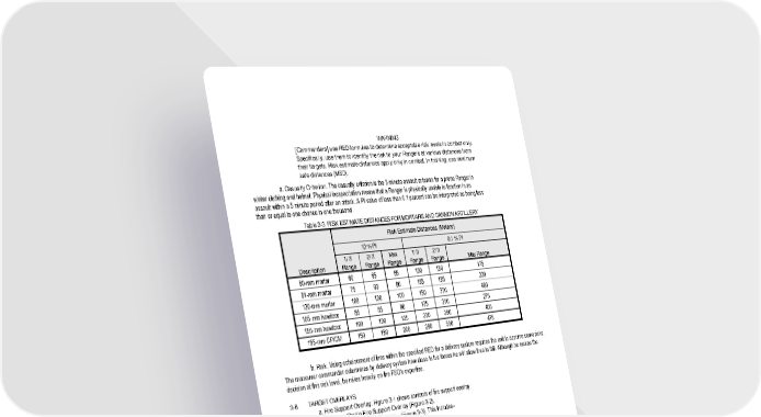 3 - 3 WARNING [Commanders] use RED formulas to determine acceptable risk levels in combat only. Specifically, use them to identify the risk to your Rangers at various distances from their targets. Risk estimate distances apply only in combat. In training, use minimum safe distances (MSD). a. Casualty Criterion. The casualty criterion is the 5 minute assault criterion for a prone Ranger in winter clothing and helmet. Physical incapacitation means that a Ranger is physically unable to function in an assault within a 5 minute period after an attack. A PI value of less than 0.1 percent can be interpreted as being less than or equal to one chance in one thousand. Table 3-3. RISK ESTIMATE DISTANCES FOR MORTARS AND CANNON ARTILLERY Risk Estimate Distances (Meters) 10 % PI 0.1 % PI Description 1/ 3 Range 2/ 3 Range Max Range 1/ 3 Range 2/ 3 Range Max Range 60-mm mortar 60 65 65 100 150 175 81-mm mortar 75 80 80 165 185 230 120-mm mortar 100 100 100 150 300 400 105-mm howitzer 85 85 90 175 200 275 155-mm howitzer 100 100 125 200 280 450 155-mm DPICM 150 180 200 280 300 475 b. Risk. Using echelonment of fires within the specified RED for a delivery system requires the unit to assume some risks. The maneuver commander determines by delivery system how close to his forces he will allow fires to fall. Although he makes the decision at this risk level, he relies heavily on the FSO's expertise. 3-6. TARGET OVERLAYS a. Fire Support Overlay. Figure 3-1 shows contents of fire support overlay. (1) Non Sterile Fire Support Overlay (Figure 3-2). (2) Sterile Fire Support Overlay (Figure 3-3). This includes– (a) Index marks to position overlay on map (b) Target symbols • Point target • Linear target • Circular target Figure 3-1. CONTENTS OF FIRE SUPPORT OVERLAY Unit and official capacity of person making overlay Routes – primary and alternate Date the overlay was prepared Phase lines and checkpoints used by the patrol Map sheet number Spares Effective period of overlay (DTG) Index marks to position overlay on map Priority target Objective ORP location Target symbols Call signs and frequencies (PRI/ ALT) Description, location and remarks column, complete