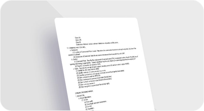 2 - 21 Class VII: Class VIII: Class IX: Distribution Methods: Include method of distribution of paddles and life jackets. 5. COMMAND AND CONTROL. a. Command. (1) Location of Commander/Patrol Leader. State where the commander intends to be during the operation, by phase if the operation is phased. (2) Succession of Command. State the succession of command if not covered in the unit’s SOP. b. Control. (1) Command Posts. Describe the employment of command posts (CPs), including the location of each CP and its time of opening and closing, as appropriate. Typically at platoon level the only reference to command posts will be the company CP. (2) Reports. List reports not covered in SOPs. c. Signal. Describe the concept of signal support, including current SOI edition or refer to higher OPORD. (1) Identify the SOI index that is in effect (2) Identify methods of communication by priority (3) Describe pyrotechnics and signals, to include arm and hand signals (demonstrate) (4) Give code words such as OPSKEDs (5) Give challenge and password (use behind friendly lines) (6) Give number combination (use forward of friendly lines) (7) Give running password (8) Give recognition signals (near/ far and day/ night) STREAM CROSSING ANNEX 1. SITUATION. a. Area of Operations. (1) Terrain. (a) River width. (b) River depth and water temperature. (c) Current. (d) Vegetation. (e) Obstacles. (2) Weather. b. Enemy Forces. Enemy (location, identification, activity). c. Friendly Forces. d. Attachments and Detachments. 2. MISSION. 3. EXECUTION. a. Concept of Operations. b. Scheme of Movement and Maneuver. c. Scheme of Fires. d. Tasks to Subordinate Units. (1) Elements. (2) Teams. (3) Individuals. e. Coordinating Instructions. (1) Crossing procedure/techniques.