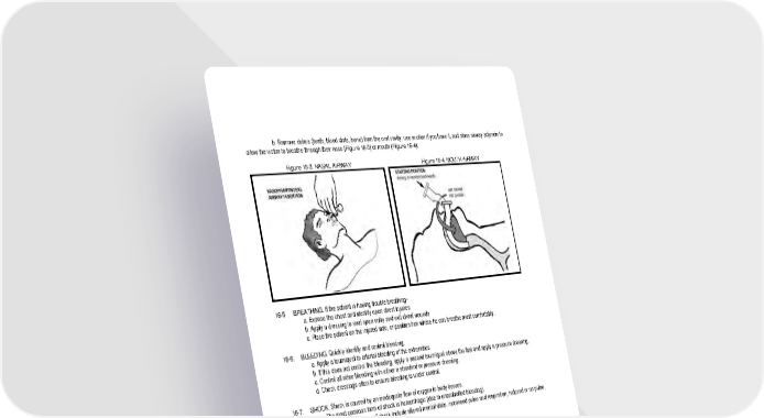 b. Remove debris (teeth, blood clots, bone) from the oral cavity; use suction if you have it; and place airway adjuncts to allow the victim to breathe through their nose (Figure 16-3) or mouth (Figure 16-4). Figure 16-3. NASAL AIRWAY Figure 16-4. MOUTH AIRWAY 16-5 BREATHING. If the patient is having trouble breathing– a. Expose the chest and identify open chest injuries b. Apply a dressing to seal open entry and exit chest wounds c. Place the patient on the injured side, or position him where he can breathe most comfortably. 16-6. BLEEDING. Quickly identify and control bleeding. a. Apply a tourniquet to arterial bleeding of the extremities b. If this does not control the bleeding, apply a second tourniquet above the first and apply a pressure dressing. c. Control all other bleeding with either a standard or pressure dressing. d. Check dressings often to ensure bleeding is under control. 16-7. SHOCK. Shock is caused by an inadequate flow of oxygen to body tissues. a. The most common form of shock is hemorrhagic (due to uncontrolled bleeding). b. Signs and symptoms of shock include altered mental state, increased pulse and respiration, reduced or no pulse, and profuse sweating. c. Basic treatment (1) Control bleeding (2) Open airway (3) Restore breathing (4) Initiate IV or saline lock (5) Monitor condition. 16-8. EXTREMITY INJURIES. Identify and control bleeding. If you suspect a fracture, splint it as it lies. Do not reposition the injured extremity. 1 16-9. ABDOMINAL INJURIES. Identify and control bleeding, and then– a. Treat for shock. b. If internal organs are exposed, cover them with dry, sterile dressing. Do not place them back in the abdominal cavity. c. Place patient in comfortable position. Flex knees to relax abdomen. d. Do not give anything by mouth to the patient.