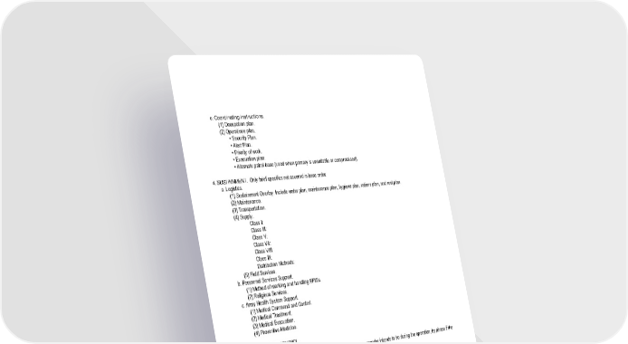 2 - 19 e. Coordinating instructions. (1) Occupation plan. (2) Operations plan. • Security Plan. • Alert Plan. • Priority of work. • Evacuation plan. • Alternate patrol base (used when primary is unsuitable or compromised). 4. SUSTAINMENT. Only brief specifics not covered in base order. a. Logistics. (1) Sustainment Overlay. Include water plan, maintenance plan, hygiene plan, rations plan, and rest plan. (2) Maintenance. (3) Transportation. (4) Supply. Class I: Class III: Class V: Class VII: Class VIII: Class IX: Distribution Methods: (5) Field Services. b. Personnel Services Support. (1) Method of marking and handling EPWs. (2) Religious Services. c. Army Health System Support. (1) Medical Command and Control. (2) Medical Treatment. (3) Medical Evacuation. (4) Preventive Medicine. 5. COMMAND AND CONTROL. a. Command. (1) Location of Commander/Patrol Leader. State where the commander intends to be during the operation, by phase if the operation is phased. (2) Succession of Command. State the succession of command if not covered in the unit’s SOP. b. Control. (1) Command Posts. Describe the employment of command posts (CPs), including the location of each CP and its time of opening and closing, as appropriate. Typically at platoon level the only reference to command posts will be the company CP. (2) Reports. List reports not covered in SOPs. c. Signal. Describe the concept of signal support, including current SOI edition or refer to higher OPORD. (1) Identify the SOI index that is in effect (2) Identify methods of communication by priority (3) Describe pyrotechnics and signals, to include arm and hand signals (demonstrate) (4) Give code words such as OPSKEDs (5) Give challenge and password (use behind friendly lines) (6) Give number combination (use forward of friendly lines) (7) Give running password (8) Give recognition signals (near/ far and day/ night)