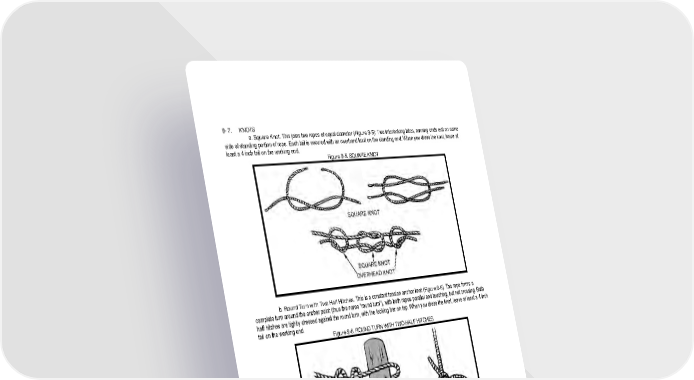 9- 7. KNOTS a. Square Knot. This joins two ropes of equal diameter (Figure 9-5): Two interlocking bites, running ends exit on same side of standing portion of rope. Each tail is secured with an overhand knot on the standing end. When you dress the knot, leave at least a 4 inch tail on the working end. Figure 9-5. SQUARE KNOT b. Round Turn with Two Half Hitches. This is a constant tension anchor knot (Figure 9-6). The rope forms a complete turn around the anchor point (thus the name “round turn”), with both ropes parallel and touching, but not crossing. Both half hitches are tightly dressed against the round turn, with the locking bar on top. When you dress the knot, leave at least a 4 inch tail on the working end. Figure 9-6. ROUND TURN WITH TWO HALF HITCHES c. End–of–the–Rope Clove Hitch. This is an intermediate anchor knot (Figure 9-7) that requires constant tension. Make two turns around the anchor (1). A locking bar runs diagonally from one side to the other. Leave no more than one rope width between turns of rope (2). Locking bar is opposite direction of pull. When you dress the knot, leave at least a 4-inch tail on the working end.
