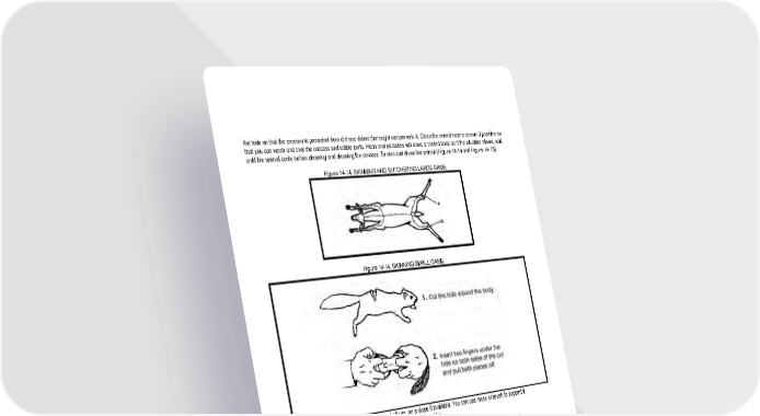 14 - 17 the hide so that the carcass is protected from dirt and debris that might contaminate it. Clean the animal near a stream if possible so that you can wash and cool the carcass and edible parts. Fleas and parasites will leave a cooled body so if the situation allows, wait until the animal cools before cleaning and dressing the carcass. To skin and dress the animal (Figure 14-14 and Figure 14-15). Figure 14-14. SKINNING AND BUTCHERING LARGE GAME Figure 14-14. SKINNING SMALL GAME (1) Position. Place carcass, belly up, on a slope if available. You can use rocks or brush to support it. (2) Genitals and or Udder. Remove genitals or udder. (3) Musk Glands. Remove these to avoid tainting meat. (4) Hide. Split hide from tail to throat. Make the cut shallow so that you do not pierce the stomach. (5) Skin. Insert your knife under the skin, taking care not to cut into the body cavity. Peel the hide back several inches on each side to keep hair out of the meat. (6) Chest Cavity. Open the chest cavity by splitting the sternum. You can do this by cutting to one side of the sternum where the ribs join. (7) Windpipe and Gullet. Reach inside and cut the windpipe and gullet as close to the base of the skull as possible. (8) Internal Organs. With the forward end of the intestinal tract free, work your way to the rear, lifting out internal organs and intestines. Cut only where necessary to free them. (9) Bladder. Carefully cut the bladder away from the carcass so that you do not puncture the bladder (urine can contaminate meat). Pinch the urethra tightly and cut it beyond the point you are pinching. Remove the bladder. (10) Anus. From the outside of the carcass, cut a circle around the anus. Pull the anus into the body cavity and out of the carcass.