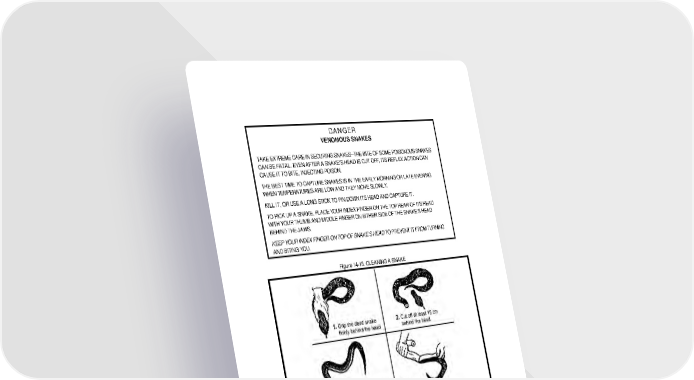 DANGER VENOMOUS SNAKES TAKE EXTREME CARE IN SECURING SNAKES--THE BITE OF SOME POISONOUS SNAKES CAN BE FATAL. EVEN AFTER A SNAKE'S HEAD IS CUT OFF, ITS REFLEX ACTION CAN CAUSE IT TO BITE, INJECTING POISON. THE BEST TIME TO CAPTURE SNAKES IS IN THE EARLY MORNING OR LATE EVENING WHEN TEMPERATURES ARE LOW AND THEY MOVE SLOWLY. KILL IT, OR USE A LONG STICK TO PIN DOWN ITS HEAD AND CAPTURE IT. TO PICK UP A SNAKE, PLACE YOUR INDEX FINGER ON THE TOP REAR OF ITS HEAD WITH YOUR THUMB AND MIDDLE FINGER ON EITHER SIDE OF THE SNAKE’S HEAD BEHIND THE JAWS. KEEP YOUR INDEX FINGER ON TOP OF SNAKE’S HEAD TO PREVENT IT FROM TURNING AND BITING YOU. Figure 14-13. CLEANING A SNAKE c. Fowl. Your first step after killing a fowl for eating or preserving is to pluck its feathers. If plucking is impractical, you can skin the fowl. Keep in mind, however, that a fowl cooked with the skin on retains more food value. Waterfowl are easier to pluck while dry, but other fowl are easier to pluck after scalding. After you pluck the fowl (1) Cut off its neck close to the body. (2) Cut an incision in the abdominal cavity and clean out the insides. Save the neck, liver, and heart for stew. Thoroughly clean and dry the entrails to use for cordage. (3) Wash out the abdominal cavity with fresh clean water. You can boil fowl or cook it on a spit over a fire. You should boil scavenger birds such as vultures and buzzards for at least 20 minutes to kill any parasites. Use the feathers from fowl for insulating your shoes clothing, or bedding. You can also use feathers for fish lures. d. Medium Sized Mammals. The game you trap or snare will generally be alive when you find it and is therefore dangerous. Be careful when you approach a trapped animal. Use a spear or club to kill it so you can keep a safe distance from it. After you kill an animal, immediately bleed it by cutting its throat. If you must drag the carcass any distance, do so before you cut off