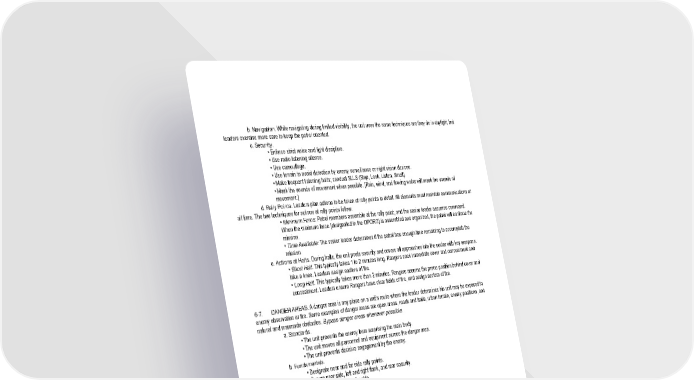 6 - 7 b. Navigation. While navigating during limited visibility, the unit uses the same techniques are they do in daylight, but leaders exercise more care to keep the patrol oriented. c. Security. • Enforce strict noise and light discipline. • Use radio listening silence. • Use camouflage. • Use terrain to avoid detection by enemy surveillance or night vision devices. • Make frequent listening halts; conduct SLLS (Stop, Look, Listen, Smell). • Mask the sounds of movement when possible. (Rain, wind, and flowing water will mask the sounds of movement.) d. Rally Points. Leaders plan actions to be taken at rally points in detail. All elements must maintain communications at all time. The two techniques for actions at rally points follow: • Minimum Force: Patrol members assemble at the rally point, and the senior leader assumes command. When the minimum force (designated in the OPORD) is assembled and organized, the patrol will continue the mission. • Time Available: The senior leader determines if the patrol has enough time remaining to accomplish the mission. e. Actions at Halts. During halts, the unit posts security and covers all approaches into the sector with key weapons. • Short Halt. This typically takes 1 to 2 minutes long. Rangers seek immediate cover and concealment and take a knee. Leaders assign sectors of fire. • Long Halt. This typically takes more than 2 minutes. Rangers assume the prone position behind cover and concealment. Leaders ensure Rangers have clear fields of fire, and assign sectors of fire. 6-7. DANGER AREAS. A danger area is any place on a unit’s route where the leader determines his unit may be exposed to enemy observation or fire. Some examples of danger areas are open areas, roads and trails, urban terrain, enemy positions, and natural and manmade obstacles. Bypass danger areas whenever possible. a. Standards. • The unit prevents the enemy from surprising the main body. • The unit moves all personnel and equipment across the danger area. • The unit prevents decisive engagement by the enemy. b. Fundamentals. • Designate near and far side rally points. • Secure near side, left and right flank, and rear security. • Recon and secure the far side. • Cross the danger area. • Plan for fires on all known danger areas. c. Technique for Crossing Danger Areas. (1) Linear Danger Area (LDA; Figure 6-4) Actions for a Squad. STEP 1. The alpha team leader (ATL) observes the linear danger area and sends the hand and arm signal to the SL, who determines to bound across. STEP 2. SL directs the ATL to move his team across the LDA far enough to fit the remainder of the squad on the far side of the LDA. Bravo team moves to the LDA to the right or left to provide an overwatch position prior to A team crossing. STEP 3. SL receives the hand and arm signal that it is safe to move the rest of the squad across (B team is still providing overwatch). STEP 4. SL moves himself, RTO and B team across the LDA. (A team provides overwatch for squad missions.) STEP 5. A team assumes original azimuth at SLs command or hand and arm signal. (2) LDA Crossing for a Platoon. (a) The lead squad halts the platoon and signals danger area.