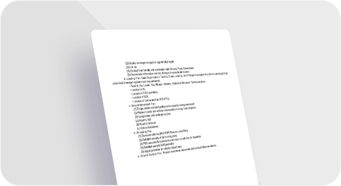 (2) Employ markings/ recognition signals (day/ night). (3) Link up. (4) Conduct final friendly unit coordination with Convoy/ Truck Commander. (5) Disseminate information and any changes to subordinate leaders. b. Loading Plan–Task Organization/ Tactical Cross-Loading. Each Ranger is assigned to a vehicle ensuring tactical cross load of weapon systems and key personnel. • Truck #, Key Leader, Key Weapon Systems, Additional Personnel, Communications. • Location of PL. • Location of PSG and Medic. • Location of WSL. • Location of communication (FO/ RTO). c. Ground Movement Plan. (1) Troops awake and alert pulling active security during movement. (2) Platoon Leader and vehicle commanders tracking route progress. (3) Compromise and contingency plan. (a) React to IED. (b) React to Ambush. (c) Vehicle breakdown. d. Unloading Plan. (1) Dismount vehicles (IAW SOP/ Reverse Load Plan). (2) Establish security of de trucking point. (3) PSG accounts for personnel and clears all vehicles for departure. (4) Establish security halt/ perimeter. (5) Adjust perimeter as vehicles depart area. e. Ground Tactical Plan. Prepare to continue movement and conduct follow on mission