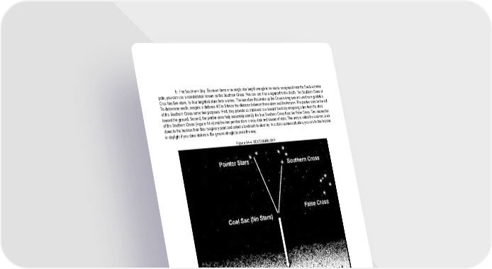 14 - 7 h. The Southern Sky. Because there is no single star bright enough to be easily recognized near the South celestial pole, you can use a constellation known as the Southern Cross. You can use it as a signpost to the South. The Southern Cross or Crux has five stars. Its four brightest stars form a cross. The two stars that make up the Cross’s long axis are used as a guideline. To determine south, imagine a distance 4.5 to 5 times the distance between these stars and the horizon. The pointer stars to the left of the Southern Cross serve two purposes. First, they provide an additional cue toward South by imagining a line from the stars toward the ground. Second, the pointer stars help accurately identify the true Southern Cross from the False Cross. The intersection of the Southern Cross (Figure 14-4) and the two pointer stars is very dark and devoid of stars. This area is called the coal sac. Look down to the horizon from this imaginary point and select a landmark to steer by. In a static survival situation, you can fix this location in daylight if you drive stakes in the ground at night to point the way. Figure 14-4. SOUTHERN SKY i. Water. Water is one of your most urgently needed resources in a survival situation. You can’t live long without it, especially in hot areas where you lose so much through sweating. Even in cold areas, you need a minimum of 2 quarts of water a day to maintain efficiency. More than three fourths of your body is composed of fluids. Your body loses fluid as a result of heat, cold, stress, and exertion. The fluid your body loses must be replaced for you to function effectively. So, one of your first objectives is to obtain an adequate supply of water. (1) Purification. Purify all water before drinking. Either • Boil it for at least one minute (plus 1 more minute for each additional 1,000 feet above sea level) or for a maximum of 10 minutes anywhere. • Use water purification tablets.