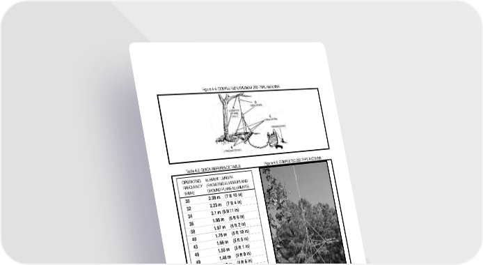 Figure 4-4. COMPLETED EXPEDIENT 292-TYPE ANTENNA Table 4-2. QUICK-REFERENCE TABLE Figure 4-5. COMPLETED 292-TYPE ANTENNA OPERATING FREQUENCY IN MHz ELEMENT LENGTH (RADIATING ELEMENTS AND GROUND-PLANE ELEMENTS) 30 2.38 m (7 ft 10 in) 32 2.23 m (7 ft 4 in) 34 2.1 m (6 ft 11 in) 36 1.98 m (6 ft 6 in) 38 1.87 m (6 ft 2 in) 40 1.78 m (5 ft 10 in) 43 1.66 m (5 ft 5 in) 46 1.55 m (5 ft 1 in) 49 1.46 m (4 ft 9 in) 52 1.37 m (4 ft 6 in) 55 1.3 m (4 ft 3 in) 58 1.23 m (4 ft 0 in) 61 1.17 m (3 ft 10 in) 64 1.12 m (3 ft 8 in) 68 1.05 m (3 ft 5 in) 72 0.99 m (3 ft 3 in) 76 0.94 m (3 ft 1 in) 4 8. ANTENNA LENGTH PLANNING CONSIDERATIONS. The length of an antenna must be considered in the construction of field expedients. At a minimum a quarter of the frequency wavelength should be used as the length of the FE Antenna. Another important factor in LOS communications is the height of the antenna with relation to the receiving station. The higher the antenna the greater the range the radio transmission will have. Terrain and curvature of the Earth affect LOS communication by absorbing