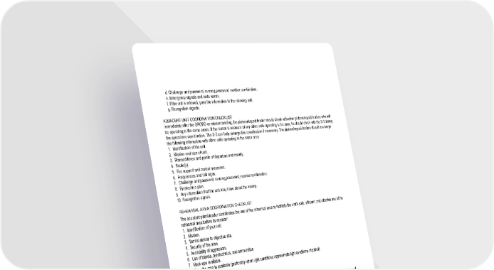 d. Challenge and password, running password, number combination. e. Emergency signals and code words. f. If the unit is relieved, pass the information to the relieving unit. g. Recognition signals. ADJACENT UNIT COORDINATION CHECKLIST Immediately after the OPORD or mission briefing, the platoon/squad leader should check with other platoon/squad leaders who will be operating in the same areas. If the leader is unaware of any other units operating is his area, he should check with the S-3 during the operations coordination. The S-3 can help arrange this coordination if necessary. The platoon/squad leaders should exchange the following information with other units operating in the same area: 1. Identification of the unit. 2. Mission and size of unit. 3. Planned times and points of departure and reentry. 4. Route(s). 5. Fire support and control measures. 6. Frequencies and call signs. 7. Challenge and password, running password, number combination. 8. Pyrotechnic plan. 9. Any information that the unit may have about the enemy. 10. Recognition signals. REHEARSAL AREA COORDINATION CHECKLIST The assistant patrol leader coordinates the use of the rehearsal area to facilitate the unit’s safe, efficient, and effective use of the rehearsal area before its mission: 1. Identification of your unit. 2. Mission. 3. Terrain similar to objective site. 4. Security of the area. 5. Availability of aggressors. 6. Use of blanks, pyrotechnics, and ammunition. 7. Mock-ups available. 8. Time the area is available (preferably when light conditions approximate light conditions of patrol). 9. Transportation. 10. Coordination with other units using the area. ARMY AVIATION COORDINATION CHECKLIST The patrol leader coordinates this with the company commander or S-3 Air to facilitate the time and detailed and effective use of aviation assets as they apply to the tactical mission: 1. SITUATION. a. Enemy. (1) Air capability. (2) ADA capability. (3) Include in Weather: Percent Illum, Illum angle, NVG Window, Ceiling, and Visibility. b. Friendly. (1) Unit(s) supporting operation, Axis of movement/corridor/routes. (2) ADA status. 2. MISSION. 3. EXECUTION. a. Concept of the Operation. Overview of what requesting unit wants to accomplish with the air assault/ air movement.