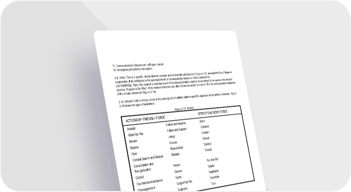 2 - 29 11. Communications (frequencies, call signs, codes). 12. Emergency procedures and signals. 2-8. TASK. This is a specific, clearly defined, decisive and measurable activity/action (Figure 2-13), accomplished by a Ranger or organization, that contributes to the accomplishment of encompassing missions or other requirements. 2-9. PURPOSE. This is the desired or intended result of the tactical operation stated in terms related to the enemy or the desired situation. Purpose is the Why? of the mission statement and often follows the words “in order to.” It is the most important component of the mission statement (Figure 2-14). 2-10. OPERATION. A military action or the carrying out of a military action to gain the objectives of any battle or campaign. Figure 2-15 shows the types of operations. Figure 2-13. TASKS ACTIONS BY FRIENDLY FORCE EFFECT ON ENEMY FORCE Assault Follow and Assume Block Attack by Fire Follow and Support Canalize Breach Linkup Contain Bypass Occupy Defeat Clear Reconstitute Destroy Combat Search and Rescue Reduce Disrupt Consolidation and Reorganization Retain Fix, Interdict Control Secure Isolate Counterreconnaissance Seize Neutralize Disengagement Support by Fire Penetrate Exfiltration Suppress Turn Figure 2-14. PURPOSE Allow Cause Create Deceive Deny Divert Enable Envelop Influence Open Prevent Protect Support Surprise