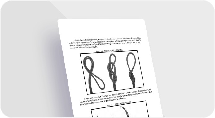 9 - 11 f. Double Figure 8. Use a Figure 8 loop knot (Figure 9-10) to form a fixed loop in the end of the rope. It can be tied at the end of the rope or anywhere along the length of the rope. Figure 8 loop knots are formed by two ropes parallel to each other in the shape of a Figure 8, no twists are in the Figure 8. Fixed loops are large enough to insert a carabiner. When you dress the knot, leave at least a 4 inch tail on the working end. Figure 9-10. DOUBLE FIGURE 8 LOOP KNOT g. Rerouted Figure 8 Knot. This anchor knot also attaches a climber to a climbing rope. Form a Figure 8 in the rope, and pass the working end around an anchor. Reroute the end back through to form a double Figure 8 (Figure 9-11). Tie the knot with no twists. When you dress the knot, leave at least a 4 inch tail on the working end. Figure 9-11. REROUTED FIGURE 8 KNOT
