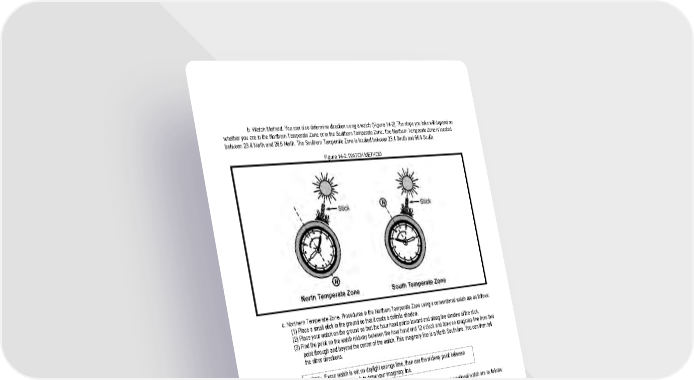 14 - 5 b. Watch Method. You can also determine direction using a watch (Figure 14-2). The steps you take will depend on whether you are in the Northern Temperate Zone or in the Southern Temperate Zone. The Northern Temperate Zone is located between 23.4 North and 26.6 North. The Southern Temperate Zone is located between 23.4 South and 66.6 South. Figure 14-2. WATCH METHOD c. Northern Temperate Zone. Procedures in the Northern Temperate Zone using a conventional watch are as follows: (1) Place a small stick in the ground so that it casts a definite shadow. (2) Place your watch on the ground so that the hour hand points toward and along the shadow of the stick. (3) Find the point on the watch midway between the hour hand and 12 o'clock and draw an imaginary line from that point through and beyond the center of the watch. This imaginary line is a North South line. You can then tell the other directions. NOTE: If your watch is set on daylight savings time, then use the midway point between the hour hand and 1 o’clock to draw your imaginary line. d. Southern Temperate Zone. Procedures in the southern temperate zone using a conventional watch are as follows: (1) Place a small stick in the ground so that it casts a definite shadow. (2) Place your watch on the ground so that 2 o'clock points to and along the shadow. (3) Find the midway point between the hour and 12 o'clock and draw an imaginary line from the point through and beyond the center of the watch. This is a North South line. (4) A hasty shortcut using a conventional watch is simply to point the hour hand at the sun in the Northern temperate zone (or point the 12 at the sun in the Southern temperate zone). Follow the last step of the watch method above to find your directions. This shortcut is less accurate than the regular method, but quicker. Your situation will dictate which method to use. e. Moon. Because the moon has no light of its own, we can only see it when it reflects the sun’s light. As it orbits the earth on its 28 day circuit, the shape of the reflected light varies according to its position. We say there is a new moon or no moon when it is on the opposite side of the earth from the sun. Then, as it moves away from the earth’s shadow, it begins to reflect light from its right side and waxes to become a full moon before waning, or losing shape, to appear as a sliver on the left side. You can use this information to identify direction. If the moon rises before the sun has set, the illuminated side will be the west. If the moon