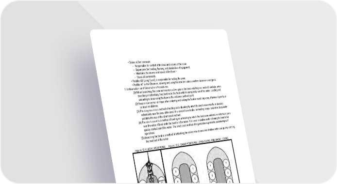 • Duties of the coxswain. – Responsible for control of the boat and actions of the crew. – Supervises the loading, lashing, and distribution of equipment. – Maintains the course and speed of the boat.¬ – Gives all commands. • Paddler #2 (Long Count) is responsible for setting the pace. • Paddler #1 is the Observer, stowing and using the bow line unless another observer is assigned. f. Embarkation and Debarkation Procedures. (1) When launching, the crew will maintain a firm grip on the boat until they are inside it: similarly, when beaching or debarking, they hold on to the boat until it is completely out of the water. Loading and unloading is done using the bow as the entrance and exit point. (2) Keep a low center of mass when entering and exiting the boat to avoid capsizing. Maintain 3 points of contact at all times. (3) The long count is a method of loading and unloading by which the boat crew embarks or debarks individually over the bow of the boat. It is used at river banks, on loading ramps, and when deep water prohibits the use of the short count method. (4) The short count is a method of loading or unloading by which the boat crew embarks or debarks in pairs over the sides of boat while the boat is in the water. It is used in shallow water allowing the boat to be quickly carried out of the water. The short count method of organization is primarily used during surf operations. (5) Beaching the boat is a method of debarking the entire crew at once into shallow water and quickly carrying the boat out of the water. Figure 13-1. BOAT POSITIONS Figure 13-2. CREW POSITIONS, LONG COUNT AND SHORT COUNT