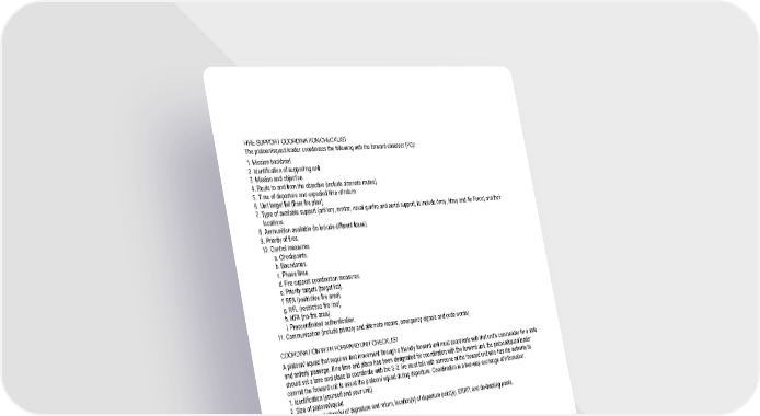 2 - 25 FIRE SUPPORT COORDINATION CHECKLIST The platoon/squad leader coordinates the following with the forward observer (FO): 1. Mission backbrief. 2. Identification of supporting unit. 3. Mission and objective. 4. Route to and from the objective (include alternate routes). 5. Time of departure and expected time of return. 6. Unit target list (from fire plan). 7. Type of available support (artillery, mortar, naval gunfire and aerial support, to include Army, Navy and Air Force) and their locations. 8. Ammunition available (to include different fuses). 9. Priority of fires. 10. Control measures. a. Checkpoints. b. Boundaries. c. Phase lines. d. Fire support coordination measures. e. Priority targets (target list). f. RFA (restrictive fire area). g. RFL (restrictive fire line). h. NFA (no-fire area). i. Precoordinated authentication. 11. Communication (include primary and alternate means, emergency signals and code words). COORDINATION WITH FORWARD UNIT CHECKLIST A platoon/ squad that requires foot movement through a friendly forward unit must coordinate with that unit’s commander for a safe and orderly passage. If no time and place has been designated for coordination with the forward unit, the platoon/squad leader should set a time and place to coordinate with the S-3. He must talk with someone at the forward unit who has the authority to commit the forward unit to assist the platoon/ squad during departure. Coordination is a two-way exchange of information: 1. Identification (yourself and your unit). 2. Size of platoon/squad. 3. Time(s) and place(s) of departure and return, location(s) of departure point(s), ERRP, and de-trucking points. 4. General area of operations. 5. Information on terrain and vegetation. 6. Known or suspected enemy positions or obstacles. 7. Possible enemy ambush sites. 8. Latest enemy activity. 9. Detailed information on friendly positions such as crew-served weapons, FPF. 10. Fire and barrier plan. a. Support the unit can furnish. How long and what can they do? (1) Fire support. (2) Litter teams. (3) Navigational signals and aids. (4) Guides. (5) Communications. (6) Reaction units. (7) Other. b. Call signs and frequencies. c. Pyrotechnic plan.