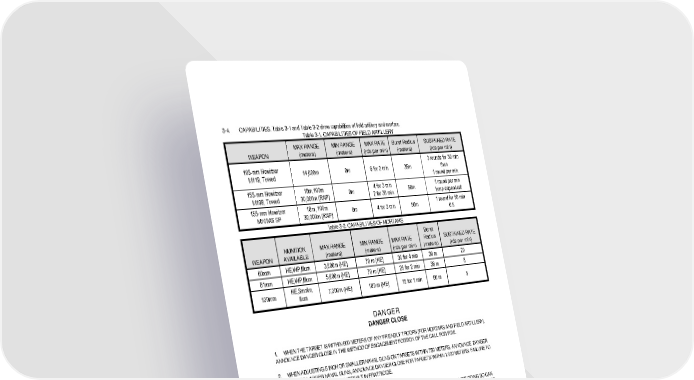 3-4. CAPABILITIES. Table 3-1 and Table 3-2 show capabilities of field artillery and mortars. Table 3-1. CAPABILITIES OF FIELD ARTILLERY WEAPON MAX RANGE (meters) MIN RANGE (meters) MAX RATE (rds per min) Burst Radius (meters) SUSTAINED RATE (rds per min) 105-mm Howitzer M119, Towed 14,000m 0m 6 for 2 min 35m 3 rounds for 30 min then 1 round per min 155-mm Howitzer M198, Towed 18m,100m 30,000m (RAP) 0m 4 for 3 min 2 for 30 min 50m 1 round per min temp dependent 155-mm Howitzer M109A6 SP 18m, 100m 30,000m (RAP) 0m 4 for 3 min 50m 1 round for 60 min 0.5 Table 3-2. CAPABILITIES OF MORTARS WEAPON MUNITION AVAILABLE MAX RANGE (meters) MIN RANGE (meters) MAX RATE (rds per min) Burst Radius (meters) SUSTAINED RATE (rds per min) 60mm HE,WP,Illum 3,500m (HE) 70 m (HE) 30 for 4 min 30 m 20 81mm HE,WP,Illum 5,600m (HE) 70 m (HE) 25 for 2 min 38 m 8 120mm HE,Smoke, Illum 7,200m (HE) 180 m (HE) 15 for 1 min 60 m 5 DANGER DANGER CLOSE 1. WHEN THE TARGET IS WITHIN 600 METERS OF ANY FRIENDLY TROOPS (FOR MORTARS AND FIELD ARTILLERY), ANNOUNCE DANGER CLOSE IN THE METHOD OF ENGAGEMENT PORTION OF THE CALL FOR FIRE. 2. WHEN ADJUSTING 5 INCH OR SMALLER NAVAL GUNS ON TARGETS WITHIN 750 METERS, ANNOUNCE DANGER CLOSE. FOR LARGER NAVAL GUNS, ANNOUNCE DANGER CLOSE FOR TARGETS WITHIN 1,000 METERS. FAILURE TO ADHERE TO THIS GUIDANCE CAN RESULT IN FRATRICIDE. 3. AVOID MAKING CORRECTIONS USING THE BRACKETING METHOD OF ADJUSTMENT, BECAUSE DOING SO CAN CAUSE SERIOUS INJURY OR DEATH. USE ONLY THE CREEPING METHOD OF ADJUSTMENT DURING DANGER CLOSE MISSIONS. MAKE CORRECTIONS OF NO MORE THAN 100 METERS BY CREEPING THE ROUNDS TO THE TARGET. 3-5. RISK ESTIMATE DISTANCES. RED applies to combat only. Minimum safe distances (Table 3-3) apply to training IAW AR 350 1. RED takes into account the bursting radius of particular munitions and the characteristics of the delivery system. It associates this combination with a percentage representing the likelihood of becoming a casualty, that is, the percentage of risk. RED is defined as the minimum distance friendly troops can approach the effects of friendly fires without suffering appreciable casualties of 0.1 percent PI or higher.
