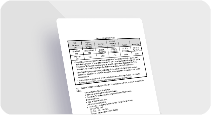 Table 4-1. FREQUENCY RANGES High Frequency (HF) Very High Frequency (VHF) Low Very High Frequency Ultra High Frequency (UHF) TACSAT UHF SATCOM 1.6 to 29.999 MHz 30.000 to 89.999 MHz 90.000 to 224.999 MHz 225.000 to 512.000 MHz 243.000 to 270.000 MHz 292.000 to 318.00 MHz long range LOS LOS 1 LOS 2 LOS 2 Satellite 2 Satellite 1 Long-range LOS; capable of round-the–world communication due to longer physical wavelengths, which cause HF transmissions to “bounce” off terrain and be reflected by the Earth’s ionosphere instead of absorbed like VHF and UHF transmissions. This keeps the transmission bouncing, essentially trapped, between the ground and the Earth’s atmosphere. For this volatile capability to offer effective communications, several factors must be ideal. 2 Line of sight (LOS) frequencies; meaning that the range of radios is limited to direct line of sight for maximum effectiveness. Curvature of the earth, mountainous terrain, and dense vegetation will degrade LOS radio maximum range capabilities. 3 Modern military communications rely on UHF Satellite Communication (SATCOM) or Dedicated Tactical Satellite Communication (TACSAT) for round-the–world real time secure voice and data communication. 4-2. MAN-PACK RADIO ASSEMBLY (AN/PRC 119F). To assemble a man-pack radio, you must first check and install a battery. a. Inspect the battery box for dirt or damage. b. Stand radio on its side with the battery cover facing up. c. Check battery life condition (you will be using the rechargeable BB 390 batteries). d. Place battery in box. e. Close and latch the battery cover. f. Return radio to upright position. g. If you installed a used battery, then enter the battery life condition into the radio: (1) Set FCTN to LD. (2) Press BAT, then CLR. (3) Enter number recorded on side of battery. (4) Press STO. (5) Set FCTN to SQ ON. h. Inspect and position the antenna. (1) Inspect whip antenna connector on antenna and on radio for damage. (2) Screw whip antenna into base. (3) Hand tighten. (4) Carefully mate antenna base with RT ANT connector. (5) Hand tighten. (6) Position antenna as needed by bending goose neck. NOTE: Keep the antenna straight, if possible. If the antenna is bent to a horizontal position, you might have to turn the radio before you can receive and transmit messages. i. Set up the handset. (1) Inspect the handset for damage. (2) Push handset on AUD/ DATA and twist clockwise to lock in place. j. Pack.