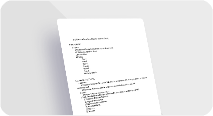 (13) Actions on Enemy Contact (Enroute and on the Ground). 4. SUSTAINMENT. a. Logistics. (1) Sustainment Overlay. Include forward area refuel/rearm points. (2) Maintenance. Specific to aircraft. (3) Transportation. (4) Supply. Class I: Class III: Class V: Class VII: Class VIII: Class IX: Distribution Methods: 5. COMMAND AND CONTROL. a. Command. (1) Location of Commander/Patrol Leader. State where the commander intends to be during the operation, by phase if the operation is phased. (2) Succession of Command. State the succession of command if not covered in the unit’s SOP. b. Control. (2) Reports. List reports not covered in SOPs. c. Signal. Describe the concept of signal support, including current SOI edition or refer to higher OPORD. (1) Air/ground call signs and frequencies. (2) Air/ground emergency code. (3) Passwords/number combinations. (4) Fire net/Quickfire net. (5) Time zone. (6) Time hack. PATROL BASE ANNEX 1. SITUATION a. Enemy Forces b. Friendly Forces c. Attachments and Detachments 2. MISSION. 3. EXECUTION. a. Concept of Operations. b. Scheme of Movement and Maneuver. c. Scheme of Fires. d. Tasks to Subordinate Units. (1) Teams. • Security. • Recon. • Surveillance. • LP/OPs. (2) Individuals.