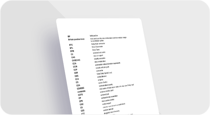 BP battle position British junction knot knot used to join the ends of detonation cords from multiple charges to one initiation system BTC bridge team commander BTL Bravo Team leader BTM Bravo Team C2 command and control CAS close air support CASEVAC casualty evacuation CCA close combat attack CCIR commander's critical information requirements CCP casualty collection point CDR commander CDS Camp Darby Special (map) CLS combat lifesaver CO company COA course of action COMSEC communications security cordelette short section of static rope or static cord. Also called "sling rope" COTS commercial off the shelf CP command post CPR cardiopulmonary resuscitation CQC close quarters combat CS combat support CSS obsolete: now referred to as sustainment CTT common task test DAR designated area of recovery DOL direction of landing double Figure 8 knot knot used to form a fixed loop in the end of the rope; loops are large enough to insert a carabiner double overhand knot knot used to secure the end of detonation cord DP duty position; decision point (depending on context) DST distance DTG date-time group dynamic ropes one of two classifications of kernmantle rope; used for climbing; see also static rope DZ drop zone EA engagement area EEFI essential elements of friendly information EENT end evening nautical twilight End-of-the-Rope Clove Hitchintermediate anchor knot that requires constant tension