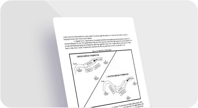 7 - 11 used in close terrain that restricts the enemy's ability to maneuver against the platoon, or in open terrain provided a means of keeping the enemy in the kill zone can be effected. • L Shaped. In an L shaped ambush, the assault element forms the long leg parallel to the enemy's direction of movement along the kill zone. The support element forms the short leg at one end of and at right angles to the assault element. This provides both flanking (long leg) and enfilading fires (short leg) against the enemy. The L shaped ambush can be used at a sharp bend in a trail, road, or stream. It should not be used where the short leg would have to cross a straight road or trail. Figure 7-4. AMBUSH FORMATIONS 7-15 HASTY AMBUSH. The platoon moves quickly to concealed positions. The ambush is not initiated until the majority of the enemy is in the kill zone. The unit does not become decisively engaged. The platoon surprises the enemy. The patrol captures, kills, or forces the withdrawal of the entire enemy within the kill zone. On order, the patrol withdraws all personnel and equipment in the kill zone from observation and direct fire. The unit does not become decisively engaged by follow on elements. The platoon continues follow on operations. Actions on the objective follow (Figure 7-5). a. Using visual signals, any Ranger alerts the unit that an enemy force is in sight. The Ranger continues to monitor the location and activities of the enemy force until his team or squad leader relieves him, and gives the enemy location and direction of movement. b. The platoon or squad halts and remains motionless. • The PL gives the signal to conduct a hasty ambush, taking care not to alert the enemy of the patrol’s presence. • The leader determines the best nearby location for a hasty ambush. He uses arm and hand signals to direct the unit members to covered and concealed positions. c. The leader designates the location and extent of the kill zone. d. Teams and squads move silently to covered and concealed positions, ensuring positions are undetected and have good observation and fields of fire into the kill zone.