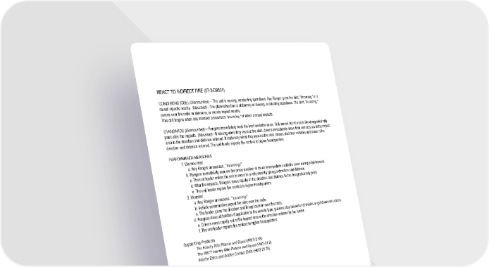 REACT TO INDIRECT FIRE (07-3-D9504) CONDITIONS (CUE) (Dismounted)— The unit is moving, conducting operations. Any Ranger gives the alert, "Incoming," or a round impacts nearby. (Mounted)—The platoon/section is stationary or moving, conducting operations. The alert, "Incoming," comes over the radio or intercom, or rounds impact nearby. This drill begins when any member announces "Incoming," or when a round impacts. STANDARDS (Dismounted)— Rangers immediately seek the best available cover. Unit moves out of area to the designated rally point after the impacts. (Mounted)—If moving when they receive the alert, drivers immediately move their vehicles out of the impact area in the direction and distance ordered. If stationary when they receive the alert, drivers start their vehicles and move in the direction and distance ordered. The unit leader reports the contact to higher headquarters. PERFORMANCE MEASURES 1. Dismounted a. Any Ranger announces, "Incoming!" b. Rangers immediately assume the prone position or move to immediate available cover during initial impacts. c. The unit leader orders the unit to move to a rally point by giving a direction and distance. d. After the impacts, Rangers move rapidly in the direction and distance to the designated rally point. e. The unit leader reports the contact to higher headquarters. 2. Mounted a. Any Ranger announces, "Incoming!" b. Vehicle commanders repeat the alert over the radio. c. The leader gives the direction and linkup location over the radio. d. Rangers close all hatches if applicable to the vehicle type; gunners stay below turret shields or get down into vehicle. e. Drivers move rapidly out of the impact area in the direction ordered by the leader. f. The unit leader reports the contact to higher headquarters. Supporting Products The Infantry Rifle Platoon and Squad (FM 3-21.8) The SBCT Infantry Rifle Platoon and Squad (FM 3-21.9) Warrior Ethos and Soldier Combat Skills (FM 3-21.75)