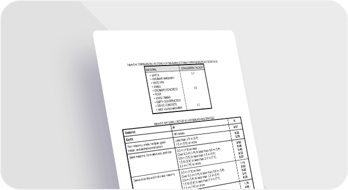 Table 5-4. CONVERSION FACTORS FOR MATERIALS OTHER THAN REINFORCED CONCRETE MATERIAL CONVERSION FACTOR • EARTH 0.1 • ORDINARY MASONRY • HARD PAN • SHALE • ORDINARY CONCRETE • ROCK • GOOD TIMBER • EARTH CONSTRUCTION 0.5 • DENSE CONCRETE • FIRST-CLASS MASONRY 0.7 Table 5-5. MATERIAL FACTOR (K) FOR BREACHING CHARGES Material R K Earth All values 0.07 Poor masonry, shale, hardpan, good timber, and earthen construction Less than 1.5 m (5 ft) 1.5 m (5 ft) or more 0.32 0.29 Good masonry, concrete block, and rock 0.3 m (1 ft) or less Over 0.3 m (1 ft) to less than 0.9 m (3 ft) 0.9 m (3 ft) to less than 1.5 m (5 ft) 1.5 M (5 ft) to less than 2.1 m (7 ft) 2.1 m (7 ft) or more 0.88 0.48 0.40 0.32 0.27 Dense concrete and first-class masonry 0.3 m (1 ft) or less Over 0.3 m (1 ft) to less than 0.9 m (3 ft) 0.9 m (3 ft) to less than 1.5 m (5 ft) 1.5 M (5 ft) to less than 2.1 m (7 ft) 2.1 m (7 ft) or more 1.14 0.62 0.52 0.41 0.35 Reinforced concrete (factor does not consider cutting steel) 0.3 m (1 ft) or less Over 0.3 m (1 ft) to less than 0.9 m (3 ft) 0.9 m (3 ft) to less than 1.5 m (5 ft) 1.5 M (5 ft) to less than 2.1 m (7 ft) 2.1 m (7 ft) or more 1.76 0.96 0.80 0.63 0.54