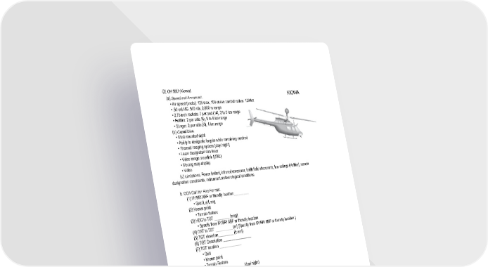 3 - 11 (2) OH 58D (Kiowa). (a) Speed and Armament. KIOWA • Air speed (knots): 125 max, 100 cruise combat radius: 120 km • .50 cal MG: 500 rds, 2,000 m range • 2.75 inch rockets: 7 per pod (14), 3 to 5 km range • Hellfire: 2 per side (4), 5 to 8 km range • Stinger: 2 per side (4), 4 km range (b) Capabilities. • Mast mounted sight • Ability to designate targets while remaining masked • Thermal imaging system (day/ night) • Laser designator/ aim laser • Video image crosslink (VIXL) • Moving map display • Video (c) Limitations. Power limited, infrared crossover, battlefield obscurants, low ceilings (Hellfire), remote designation constraints, instrument meteorological conditions b. CCA Call for Fire Format. (1) IP/ BP/ ABF or friendly location_________ • Grid/ Lat Long (2) Known point • Terrain feature (3) HDG to TGT _________ (mag) • Specify from IP/ BP/ ABF or friendly location (4) DST to TGT __________ (m) (Specify from IP/ BP/ ABF or friendly location.) (5) TGT elevation_________ (ft msl) (6) TGT Description _________________ (7) TGT location _____________ • Grid • Known point • Terrain Feature (8) Type TGT Mark __________ (day/ night) (9) Location of friendly __________ • Omit if previously given • Grid/ Lat Long • Known point • Terrain feature (10) Egress direction___________ • Cardinal, to avoid overflying threats