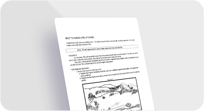 8 - 9 REACT TO AMBUSH (FAR) (07-3-D9503) CONDITIONS (CUE) (Dismounted/Mounted) — The platoon/ squad/ section moves tactically, conducting operations. The enemy initiates contact with direct and indirect fire. NOTE: This drill begins when the enemy initiates ambush with direct and indirect fire. STANDARDS (Dismounted)—The unit immediately returns fire and occupies covered and/or concealed positions. The unit moves out of the kill zone, locates the enemy position, and conducts fire and maneuver to destroy the enemy. (Mounted)—Vehicle gunners immediately return fire on known or suspected enemy positions as the unit continues to move out of the kill zone. The unit leader reports the contact to higher headquarters. PERFORMANCE MEASURES 1. Dismounted (Figure 8-7 and Figure 8-8). a. Rangers receiving fire immediately return fire, seek cover, establish a support-by-fire position, and suppress the enemy position(s). b. Rangers not receiving fire move along a covered and concealed route to the enemy’s flank in order to assault his position. Figure 8-7